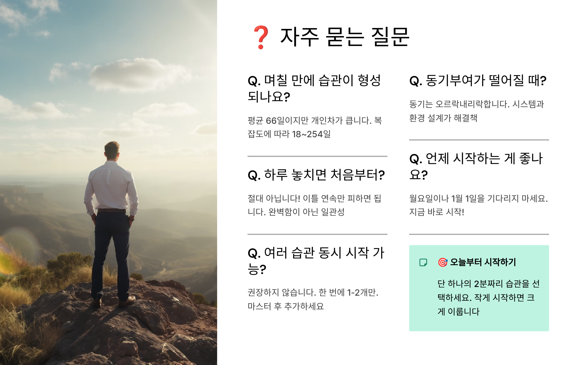 A8. 평균 66일이지만 개인차가 커요. 18일에서 254일까지 다양하답니다. 복잡도, 개인 성향, 환경 등이 영향을 미쳐요. 숫자에 집착하지 말고 "의식적 노력 없이 자연스럽게 하게 되는 시점"을 목표로 삼으세요. 대부분 3개월 정도면 상당한 자동화가 일어난답니다.