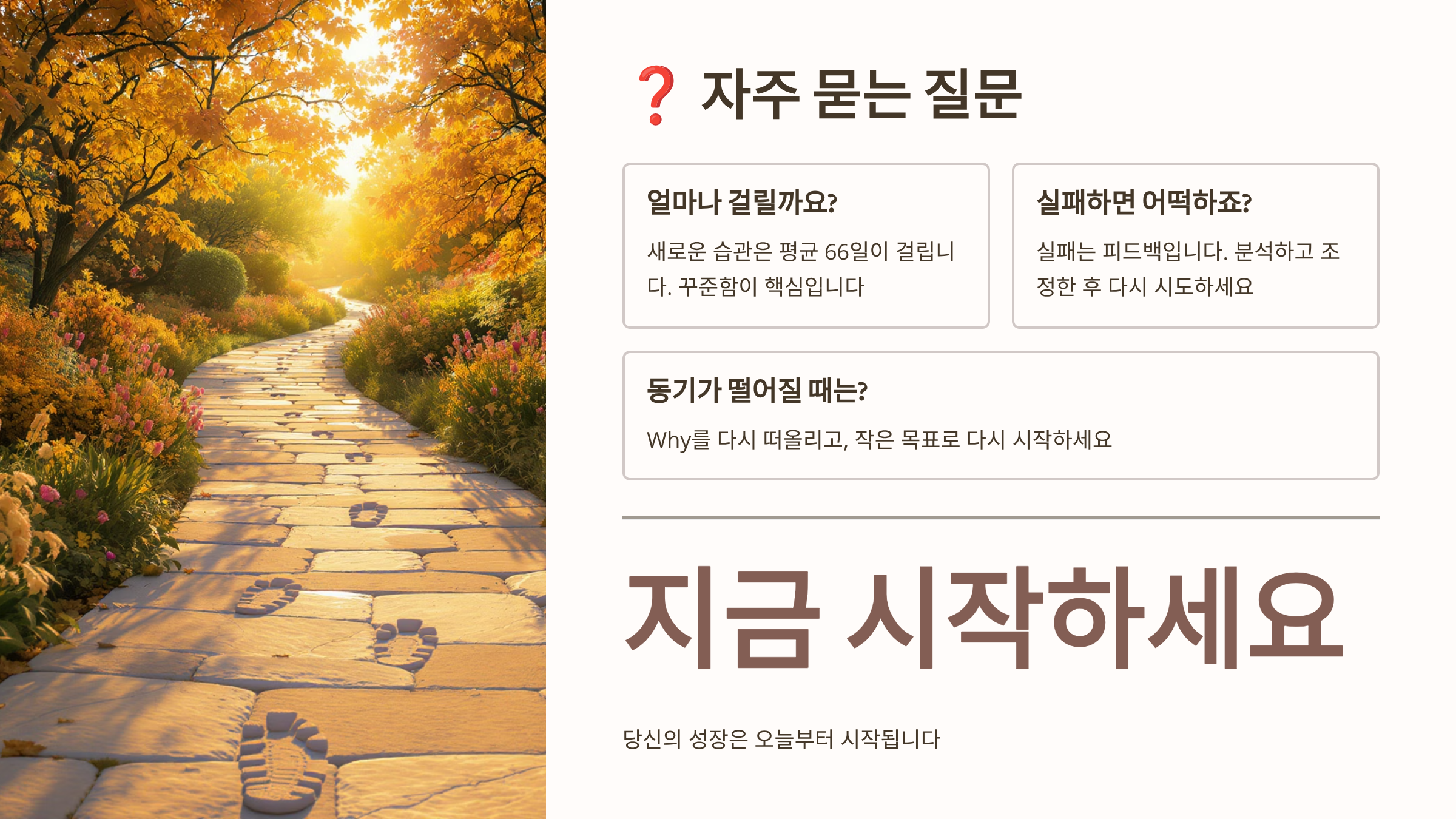 루틴은 21일이면 습관이 되고, 66일이면 자동화된다고 해요. 처음엔 의식적으로 노력해야 하지만, 시간이 지나면 자연스럽게 몸에 배게 돼요. 작은 루틴부터 시작해서 점차 확장해 가는 것이 성공의 비결이에요. 매일 같은 시간에 일어나는 것부터 시작해 보세요! ⏰