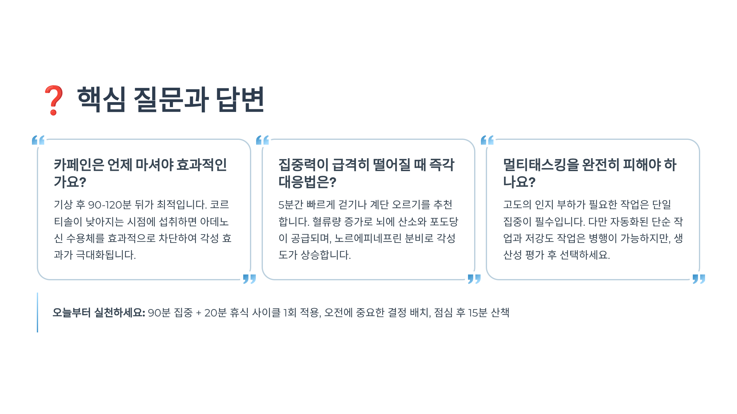 A5. 시간 블록킹으로 유사한 업무를 묶어 처리하고, 작업 전환 시 30초간 심호흡으로 리셋하세요. 중요도와 긴급도 매트릭스로 우선순위를 정하고, 할 일 목록을 시각화해 두면 인지 부하를 줄일 수 있어요.