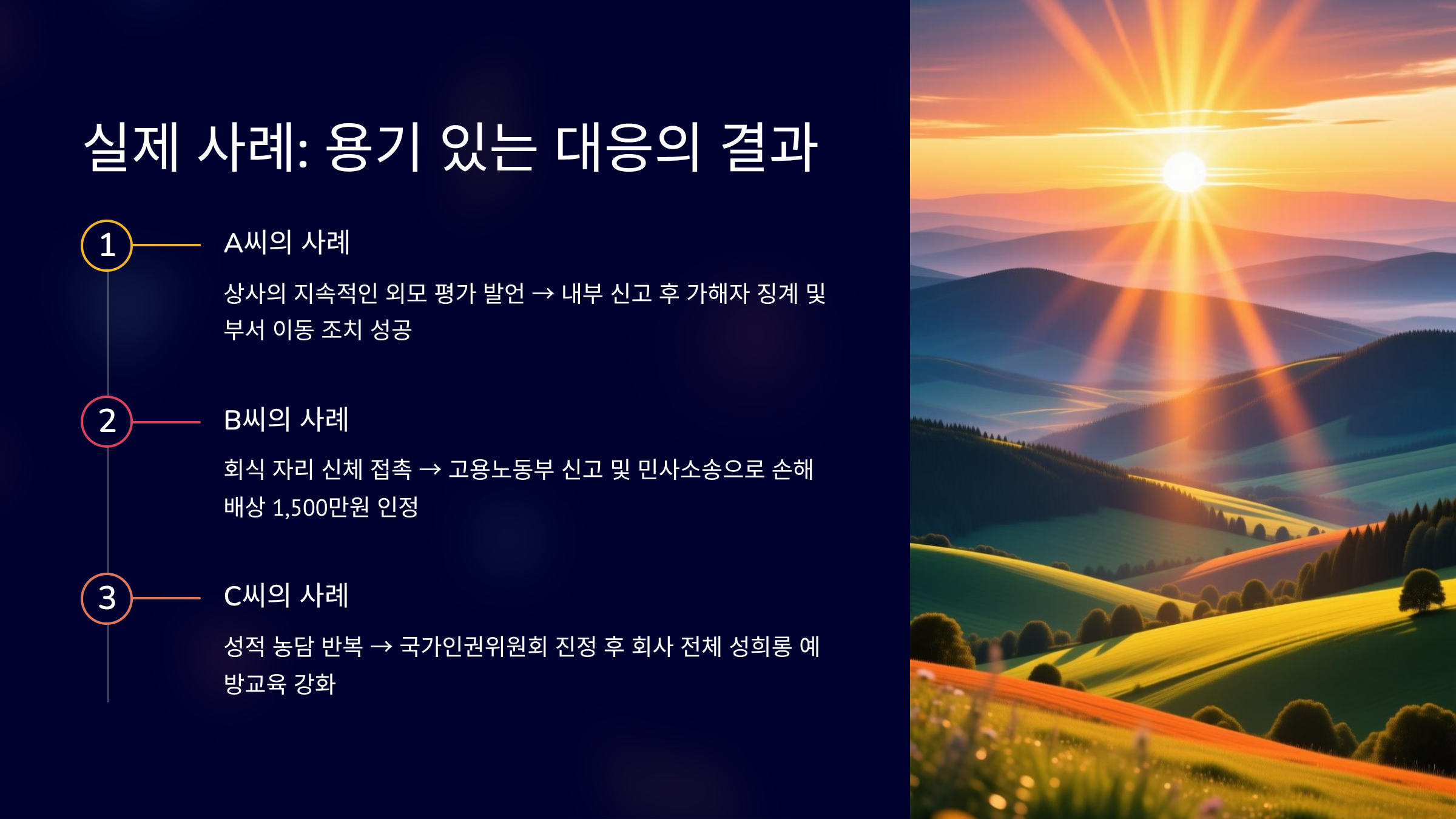 두 번째 사례는 외부 기관 신고를 통해 해결된 B 씨의 경우예요. B 씨는 소규모 스타트업에서 일했는데, 대표이사로부터 성희롱을 당했어요. 회식 자리에서 대표가 B 씨의 손을 잡고 "예쁘다"며 불쾌한 신체 접촉을 했어요. 회사 내에 별도의 고충처리 시스템이 없었고, 대표가 가해자였기 때문에 내부 신고가 불가능했어요.