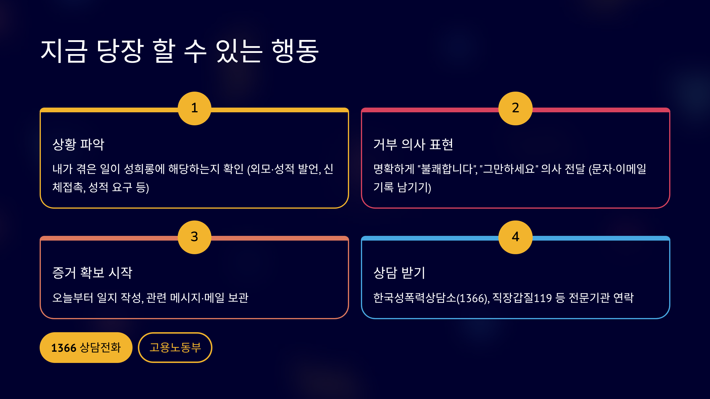 성희롱 피해를 당했을 때 당장 무엇을 해야 할지 막막할 수 있어요. 여기 실질적으로 도움이 되는 행동 체크리스트를 정리했어요. 하나씩 따라 하시면 체계적으로 대응할 수 있을 거예요. 상황에 따라 순서를 조정해도 괜찮아요.