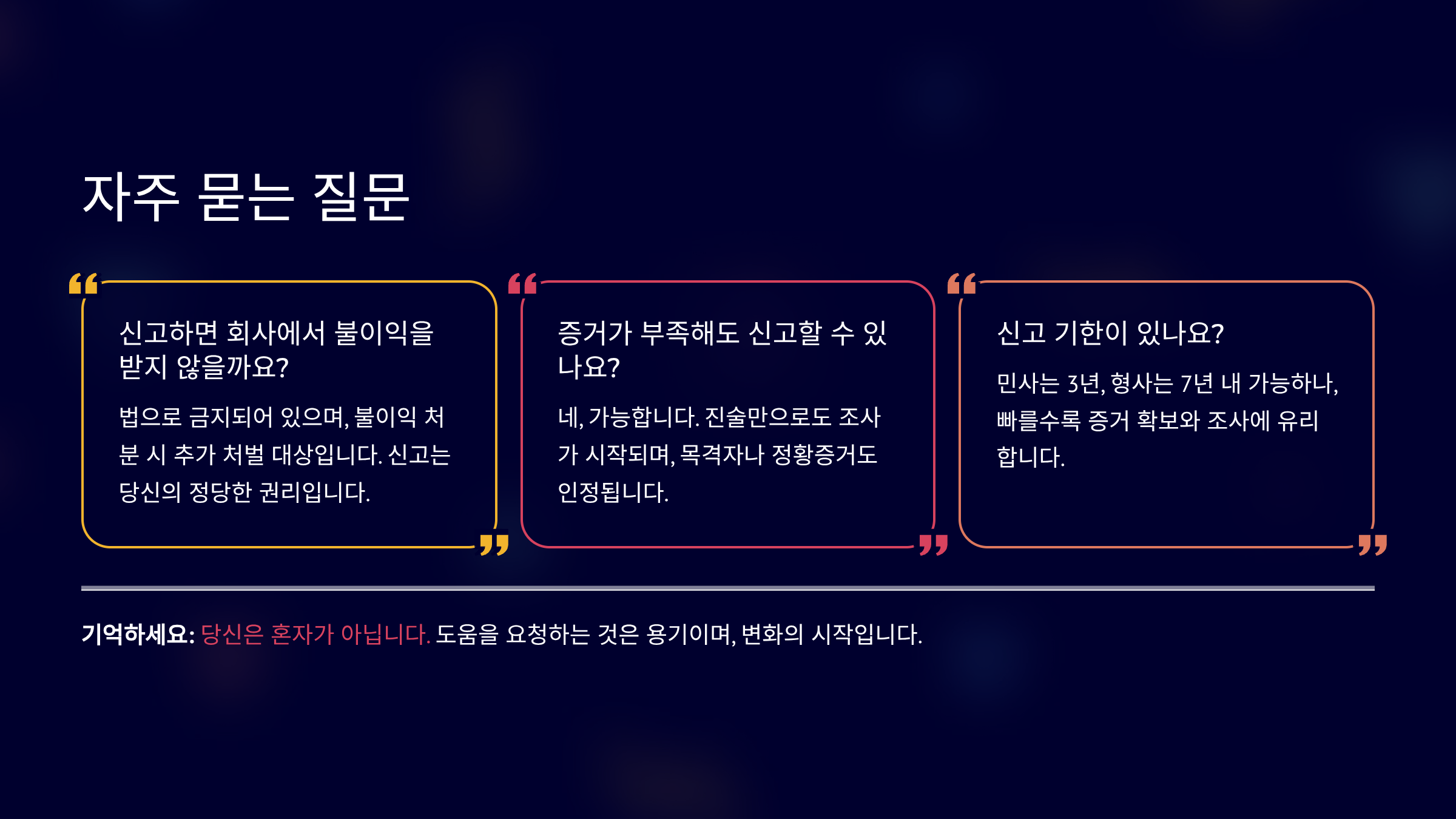 A7. 신고로 인한 불이익 조치는 법으로 금지되어 있어요. 보복을 당하면 고용노동부에 추가로 신고하세요. 가해자와 사업주 모두 처벌받을 수 있고, 피해자는 손해배상을 청구할 수 있어요.