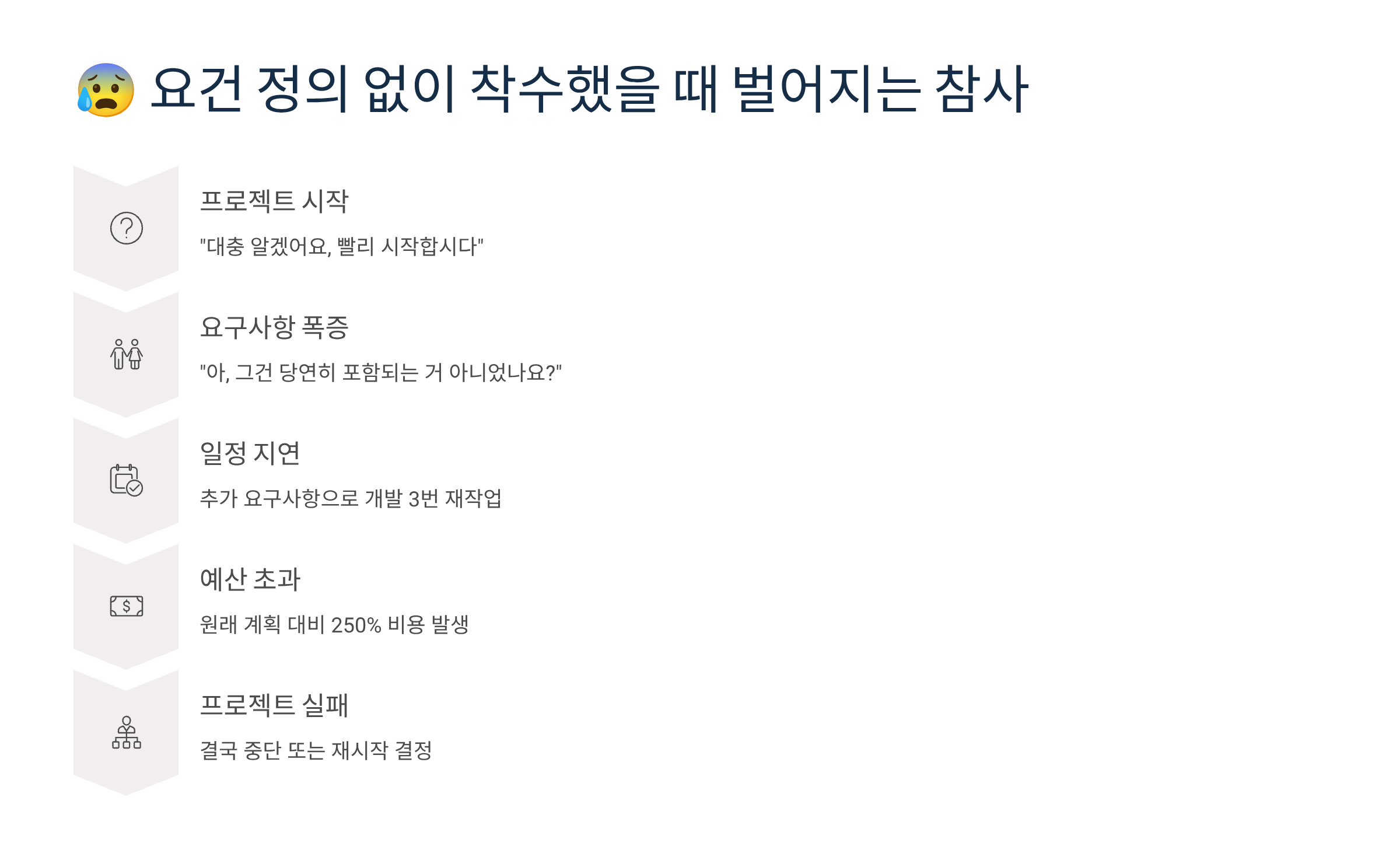 다섯 번째 문제는 팀원 간의 갈등이에요. 요건이 불명확하면 각자 다른 해석을 하게 되고, 그 해석의 차이가 갈등으로 이어져요. 기획자는 이렇게 생각했는데 개발자는 저렇게 이해했고, 디자이너는 또 다른 방향으로 작업했어요. 나중에 이 차이가 드러나면 서로 책임 공방이 벌어지고, 팀 분위기가 급격히 나빠지게 되죠.