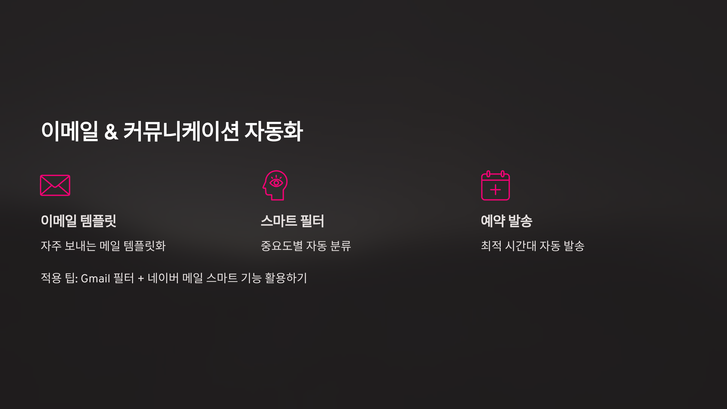| 자동 필터링 | 규칙 생성 → 조건 설정 → 동작 지정 | 일 20분 |