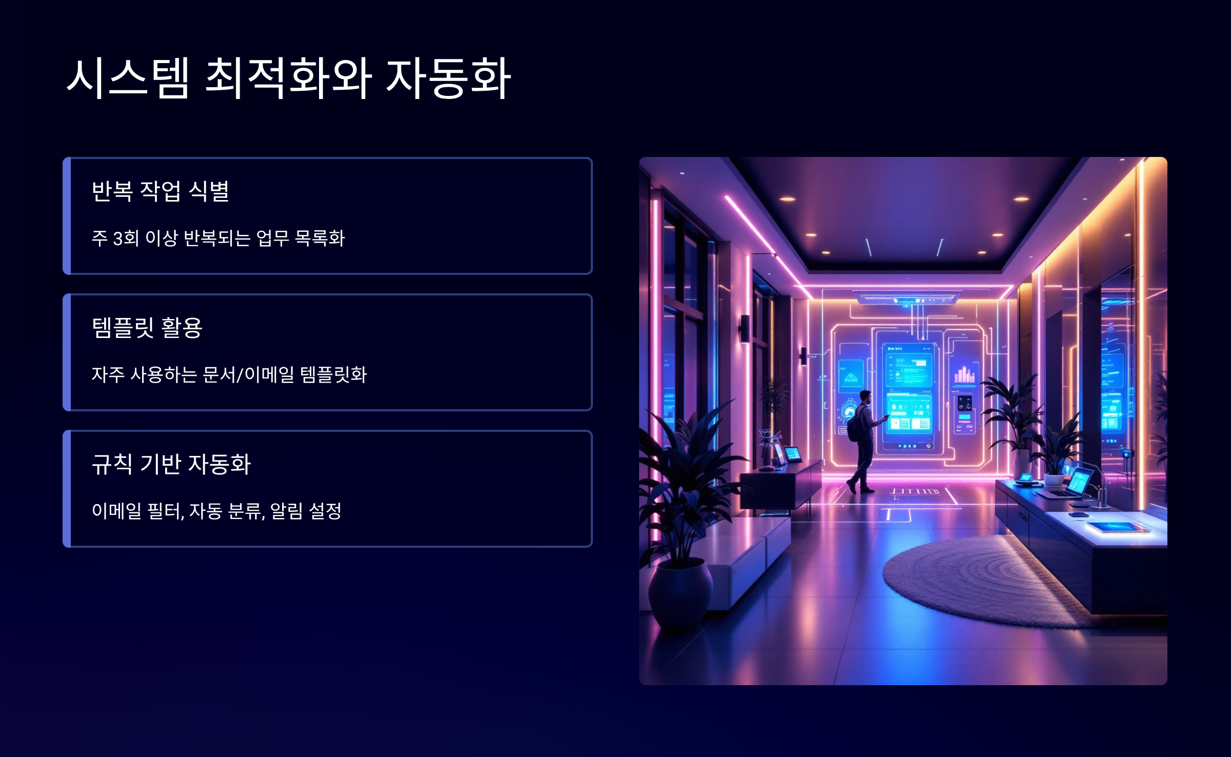 | 자동화 도구 | 반복 업무 70% 감소 | 창의적 업무 시간 3배 증가 |