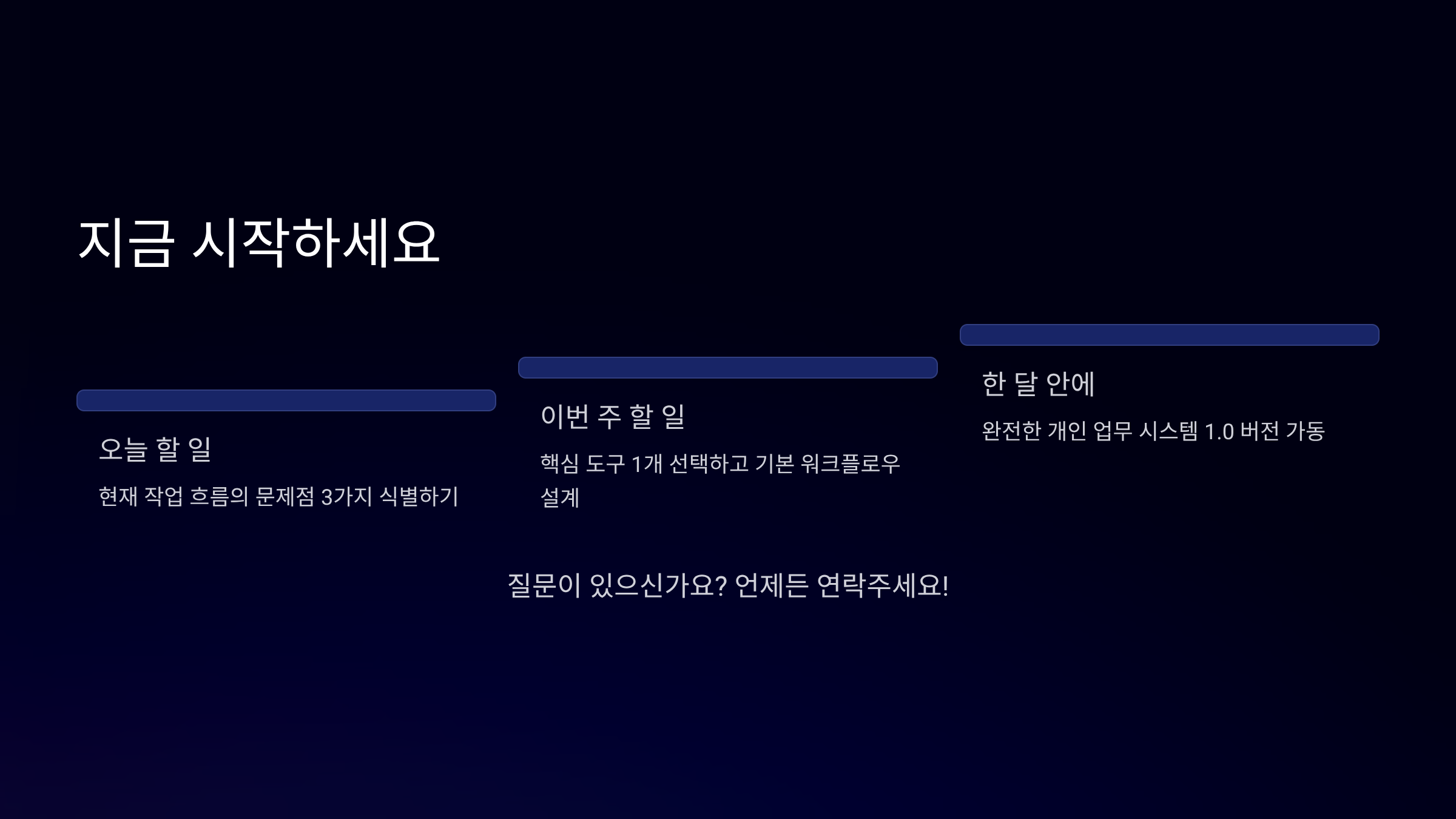 | 3주차 | 프로세스 확립 | 루틴 설정, 템플릿 제작 | 핵심 업무 표준화 |